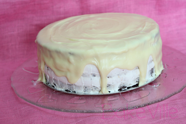 Suklaakakku karamelli täytteellä ja valkosuklaa kuorrutteella. Yhä liian pitkä.